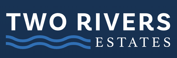Logo for Two Rivers Estates with blue wave design on a dark background