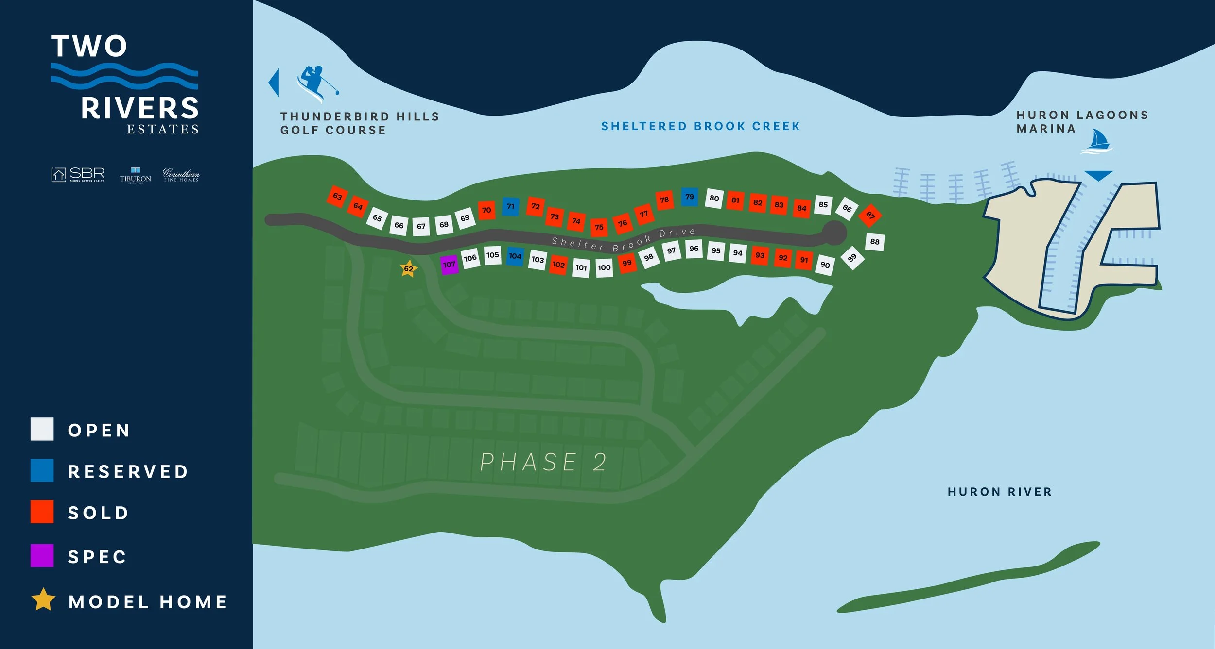 Community development map with labeled lots and statuses, including sold, open, reserved, spec homes, and model home, near Thunderbird Hills Golf Course and Huron Lagoons Marina.